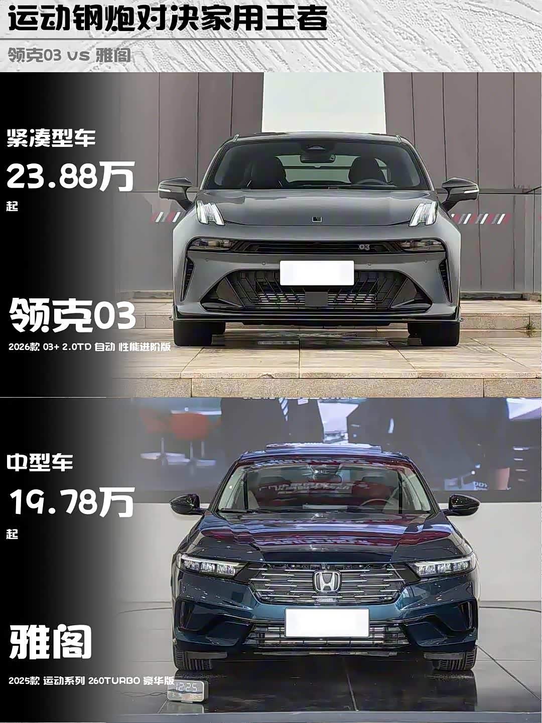 最近试驾了两台风格截然不同的车——2026款 领克03(参数|询价)+ 2.0TD性能进阶版和2025款雅阁260TURBO豪华版,一个国产性能小钢炮,一个日系经典B级车,真的让我纠结到爆!🔥