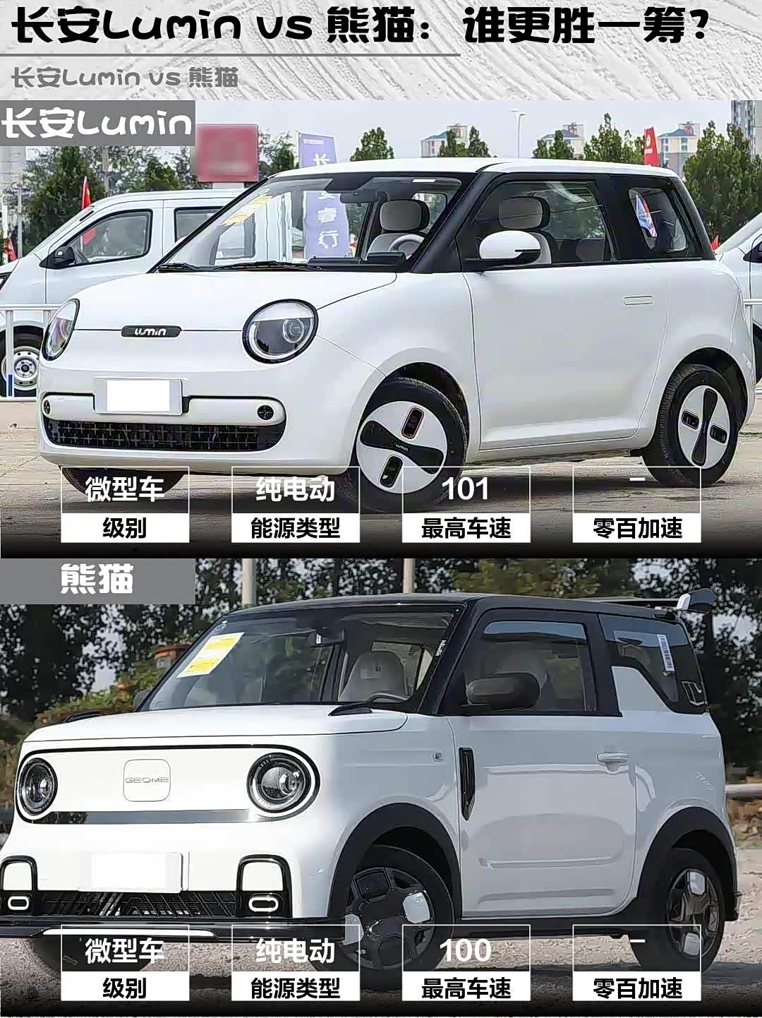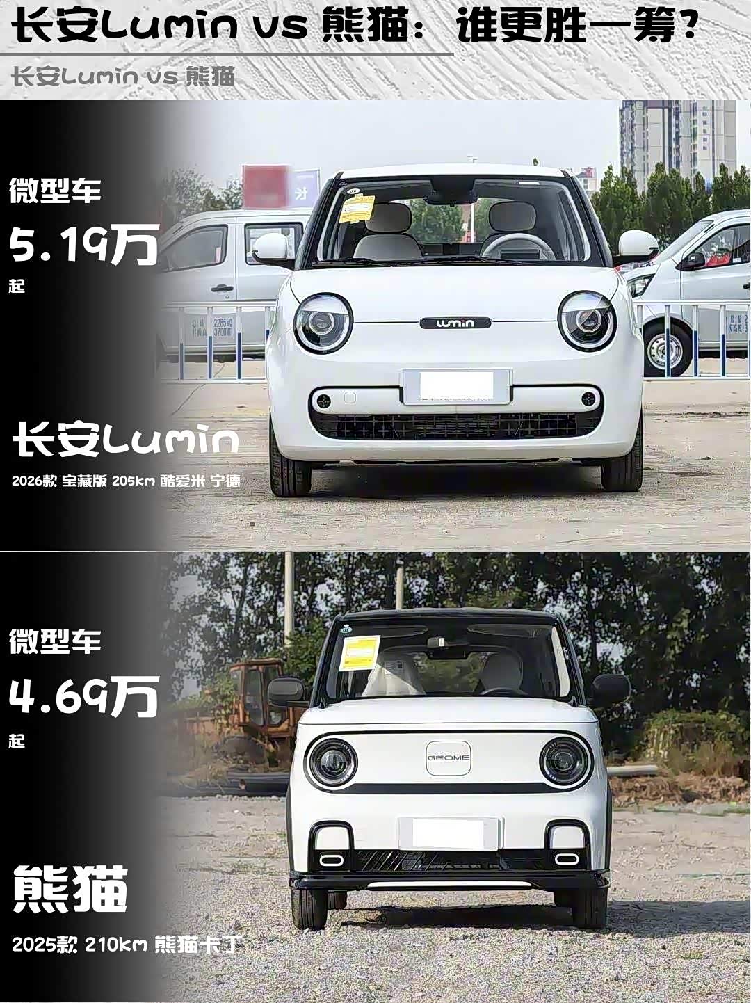 最近在纠结选微型电动车的小伙伴看过来!今天深度对比两款5万级萌系选手—— 长安Lumin(参数|询价) 2026款宝藏版205km酷爱米 vs 熊猫2025款210km卡丁版,实测干货奉上!🔥
