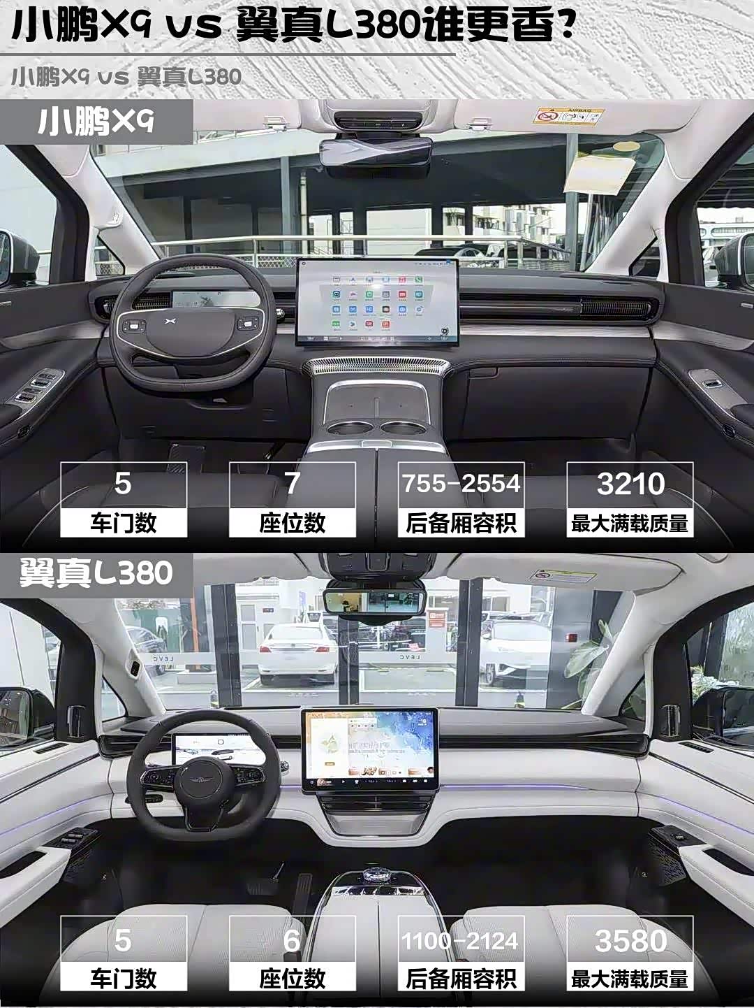 小鹏X9的2+2+3布局更适合家用,第三排能电动折叠成2米大床,露营模式直接封神🏕️ 翼真L380的6座商务范更足,第二排两个独立航空座椅带腿托按摩,但后备箱常规状态只有1100L,比小鹏小了近30%