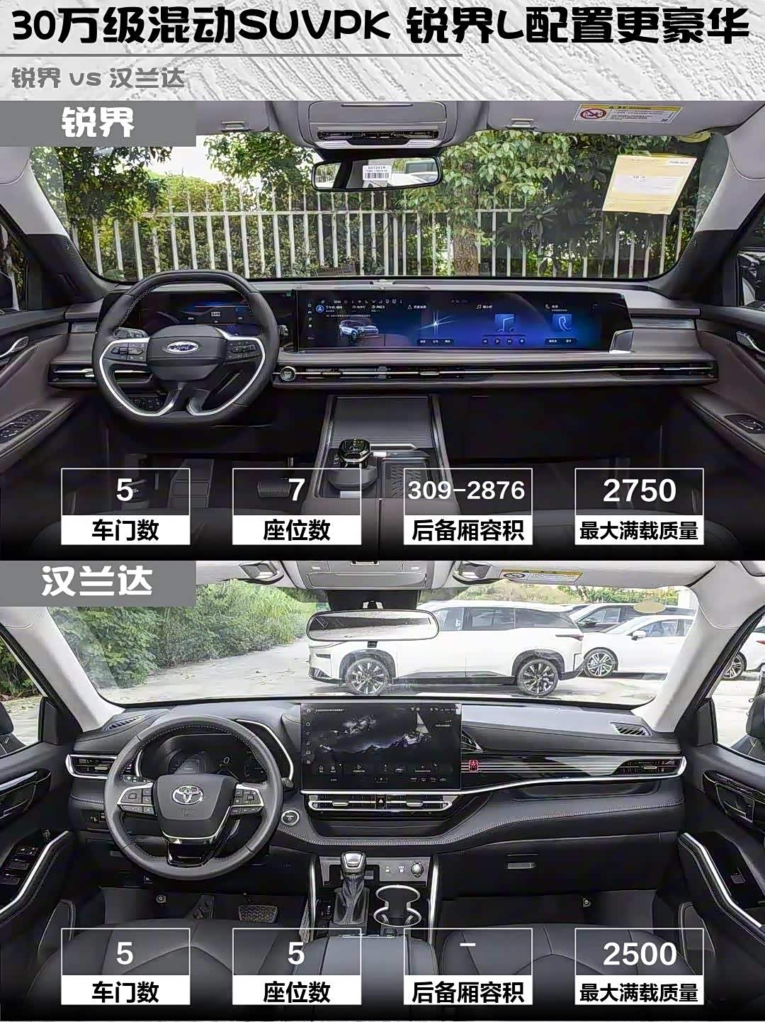 锐界L的27英寸巨屏+360全景影像+四驱系统,对比汉兰达15.6英寸屏+倒车影像+两驱,科技感完胜!但汉兰达的丰田智行安全系统更成熟,车机虽然像老年机但基本功能稳定。重点夸下锐界L的二排独立座椅,带通风加热+无线充电,汉兰达精英版连电动调节都没有...😅