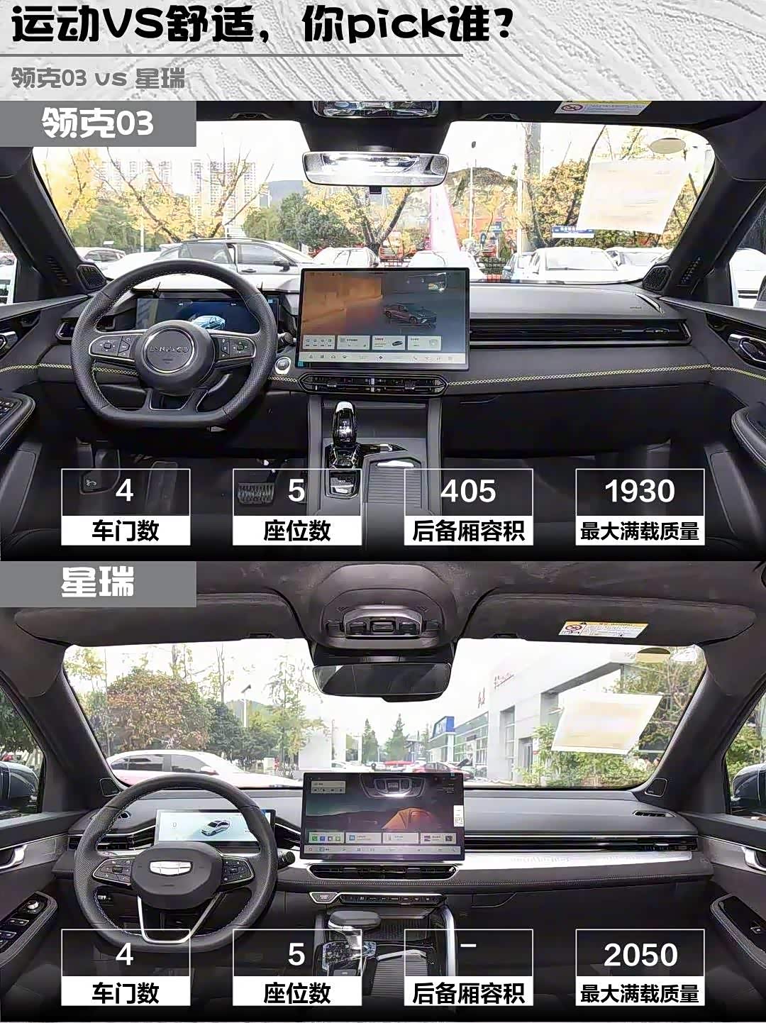 领克03的翻毛皮方向盘+金属踏板战斗值拉满,但减配了眼镜盒/备胎;星瑞的麂皮座椅+水晶挡把豪华感足,但得喝95号细粮⛽ 最绝的是领克03自带赛道模式彩蛋,星瑞则藏着BOSE音响+车载香氛这种闷骚配置!
