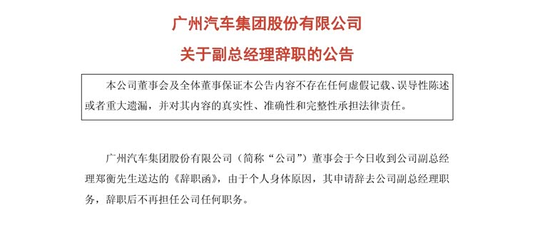 近日广汽集团发布公告称,公司副总经理郑衡因个人身体原因,已经向董事会提交辞呈,申请辞去副总经理职务。广汽集团强调,郑衡辞职后将不再担任公司任何职务,且此变动不会对企业的日常运营产生实质性影响。