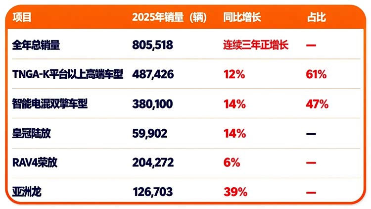 2025年,一汽丰田全年累计销售新车805,518辆,实现连续三年正增长。