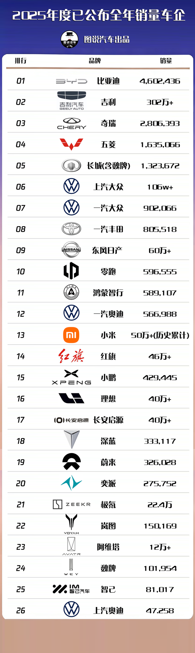 3、接下来是奇瑞,奇瑞全年销量280多万台,感觉奇瑞在2026年如果能够在星途3.0产品上做好,在风云系列产品上继续挖掘潜力,销量有望能突破300万,捷途品牌着实为奇瑞创造了不少销量。
