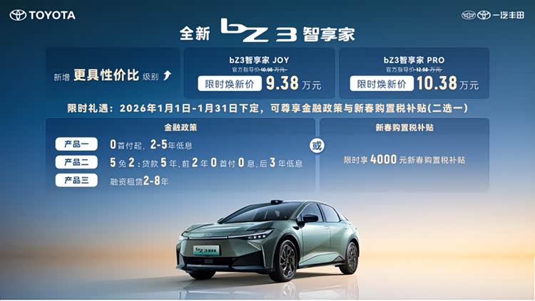 2025年12月31日,一汽丰田针对bZ系列两款纯电车型开展焕新发布,明确了bZ3智享家JOY版与PRO版的限时焕新售价,分别为9.38万元和10.38万元。