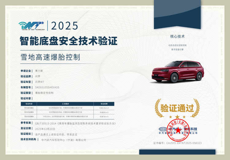 这个冬季,一场考验汽车综合实力的极寒测试在专业场地内落下帷幕。12月30日,中国汽车技术研究中心(中汽中心)正式揭晓了2025年冬季测试的成果。在这场以“用户冬季真实困境”为标尺的严苛评估中,全新问界M7凭借其在极端低温环境下的全面可靠表现,成功斩获“综合性能类验证”及“智能底盘安全技术验证”两项权威认证,为消费者在冰雪季节的出行,提供了一份坚实可靠的安全与技术背书。