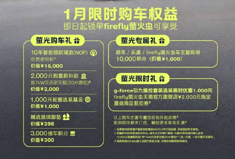 firefly萤火虫推出1月限时购车权益,即日起锁单可享受包含10年智能领航辅助、2000元购置税补贴或7kW交流家充桩、1000元轮圈选装基金、精选簇绒脚垫、3000元提车积分等。