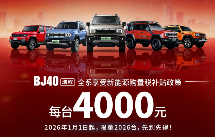 BJ40增程全系也在国补的基础之上额外增加新能源购置税补贴4000元!不过限量只有2026台,先到先得。