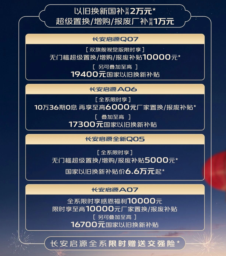 长安启源针对全新Q05、Q07、A06、A07都推出了在国补基础上的额外超级置换/增购/报废补贴至高1万元。