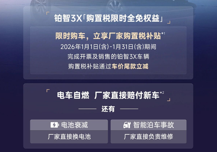 广汽丰田针对铂智3X给出了购置税全免政策,此外,广汽丰田“三担责”政策(电池自燃担责、智能泊车辅助事故担责外、电池衰减担责)将会延续至2026年底。