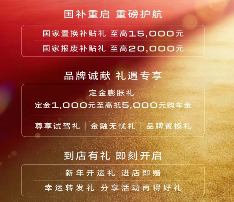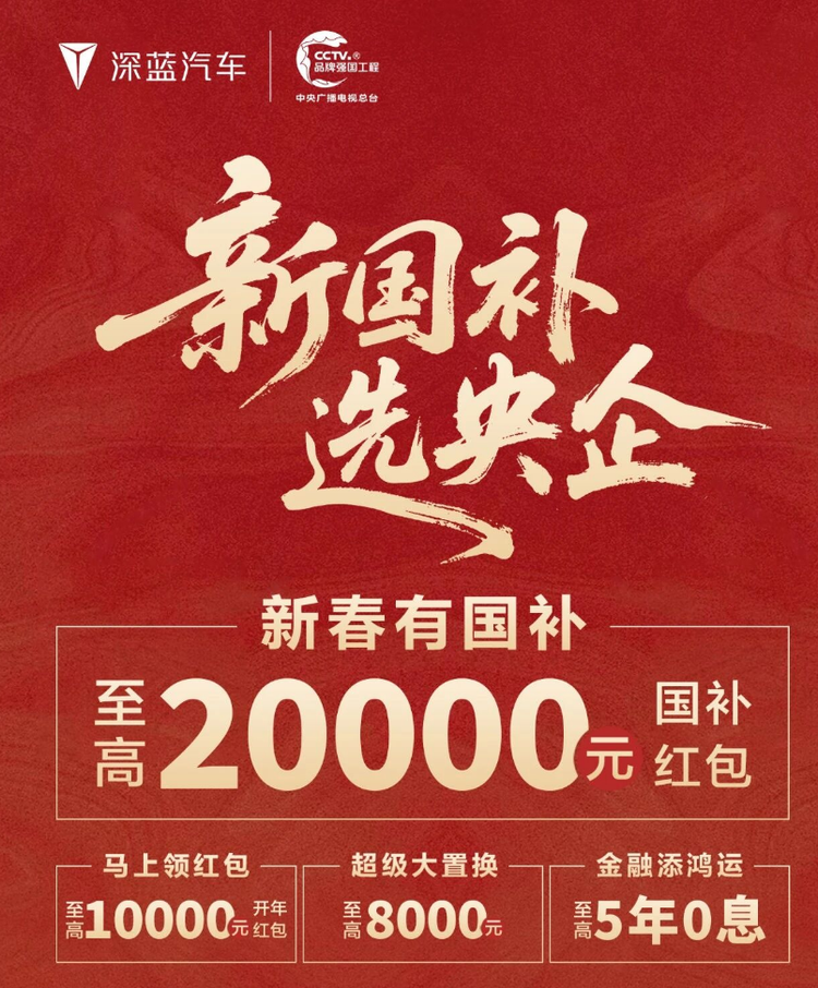 深蓝汽车推出“四重礼”:至高20000元国补红包、至高10000元开年红包、至高8000元置换礼以及至高5年0息金融礼,这些优惠可以同时享受,累计价值可观。