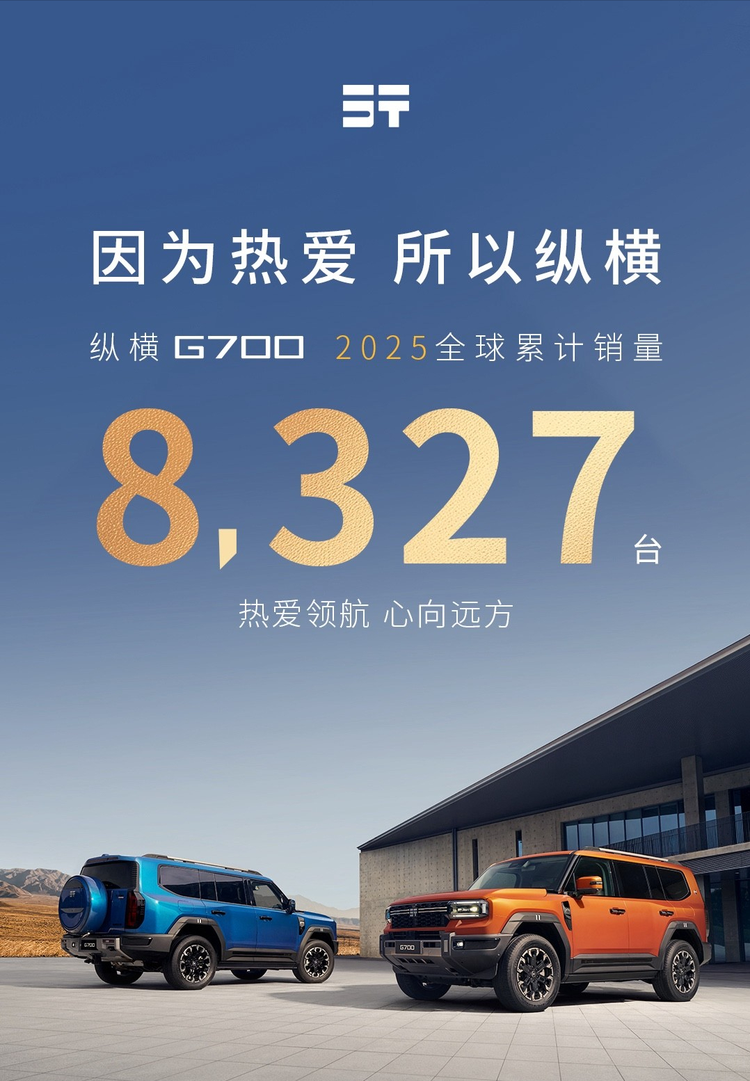 回望2025,纵横G700全球销量8327辆,不仅是一份亮眼的市场答卷,更是“心所向,自纵横”精神图腾的全球共鸣。从品牌诞生时的初心破界,到产品落地时的实力立标,再到体系成型时的守护赋能,纵横以东方智慧解构“豪华=西方专属”的行业桎梏,走出了一条以用户精神共鸣为核心的中国豪华越野引领之路。