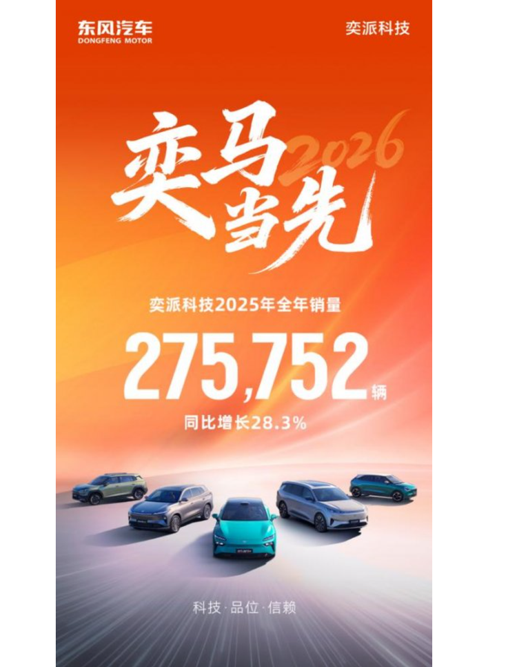 2026年1月1日,奕派科技公布2025年度销量业绩。公司自成立以来,月度销量始终保持同比增长态势;全年累计销售整车275752辆,同比增长28.3%,成为推动东风汽车年度新能源销量突破100万辆的关键力量。