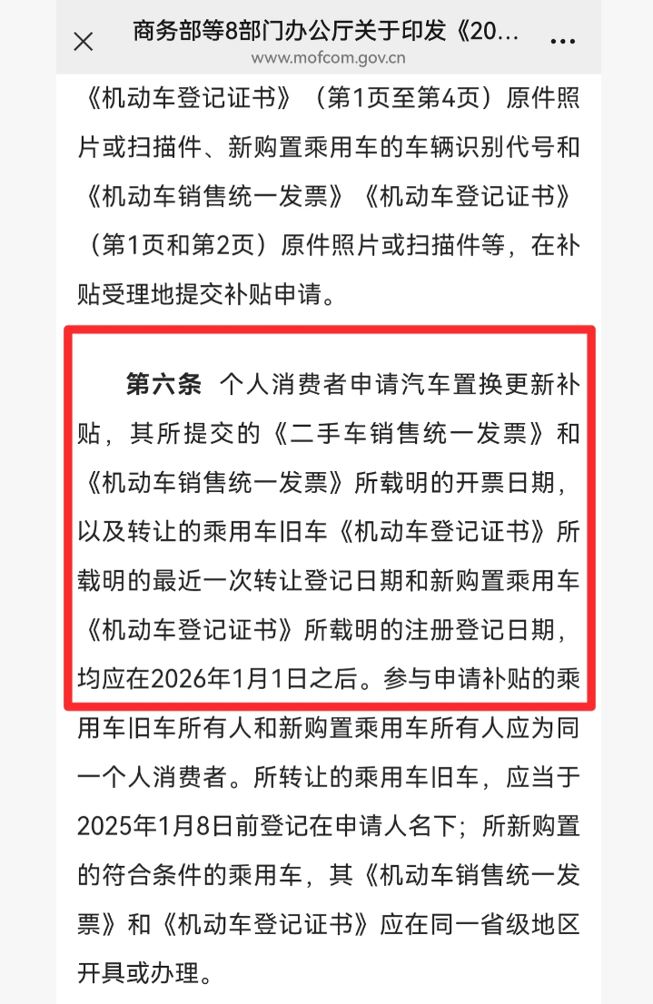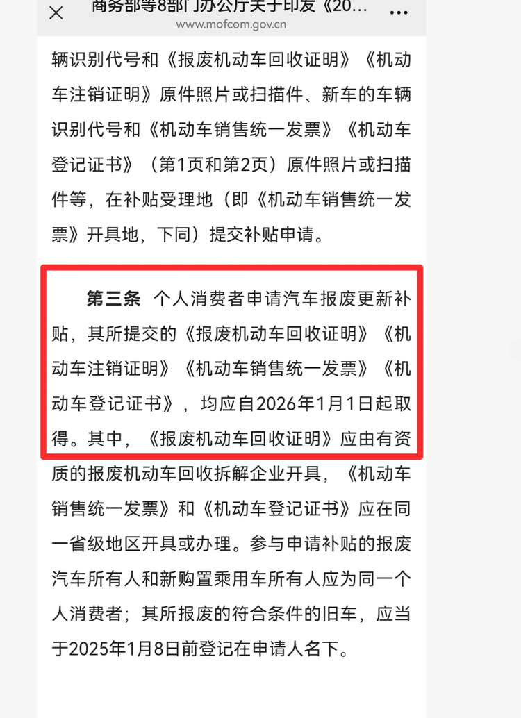 先看报废更新补贴,核心要求聚焦 “旧车报废 + 新车购置” 的组合。首先,报废的旧车必须在 2025 年 1 月 8 日之前登记在申请人名下,这意味着刚入手不久的旧车无法享受该类补贴;其次,所有关键手续都要在 2026 年 1 月 1 日之后办理 —— 包括由有资质的回收拆解企业开具的《报废机动车回收证明》、车辆管理部门出具的《机动车注销证明》,以及新车的《机动车销售统一发票》《机动车登记证书》。值得注意的是,新车的购车发票和登记证书必须在同一省级地区办理,且报废旧车和购置新车的必须是同一个人消费者,避免了他人代买、跨区域操作的情况。