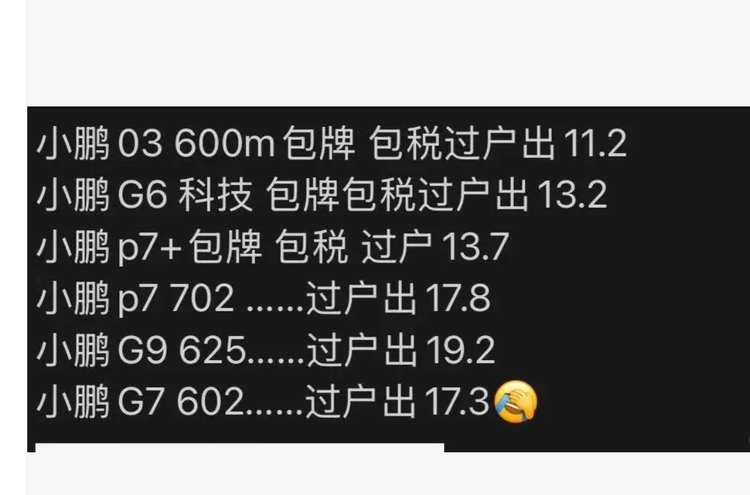 新能源汽车市场迎来超强福利!小鹏近期推出重磅优惠活动,旗下03、G6、P7+、G7、G9等热门车型,全部以“包牌包税过户”形式低价开售,其中 小鹏G6(参数|询价)科技版仅需13.2万,P7+ 13.7万即可入手,G9 625版本也降至19.2万,清一色0公里二手车(未上牌新车)配置,让意向消费者直呼“性价比天花板”。