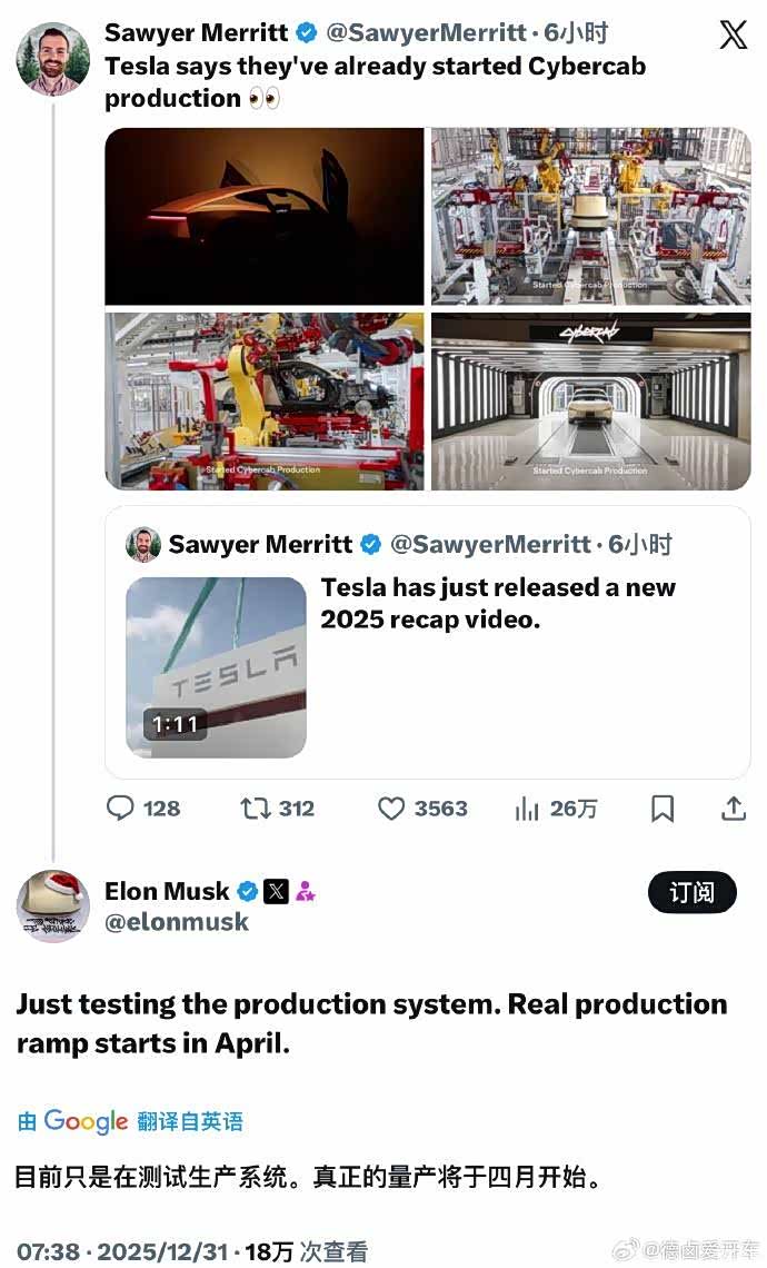 特斯拉 Cybercab 将于 2026 年 4 月量产