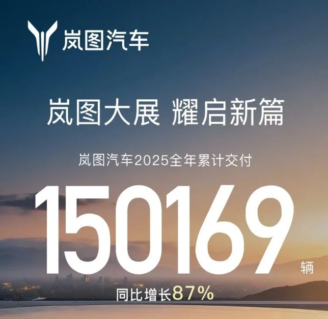 2025年累计交付150169辆,同比增87%,未达成20万辆年度目标,完成率75.1%。