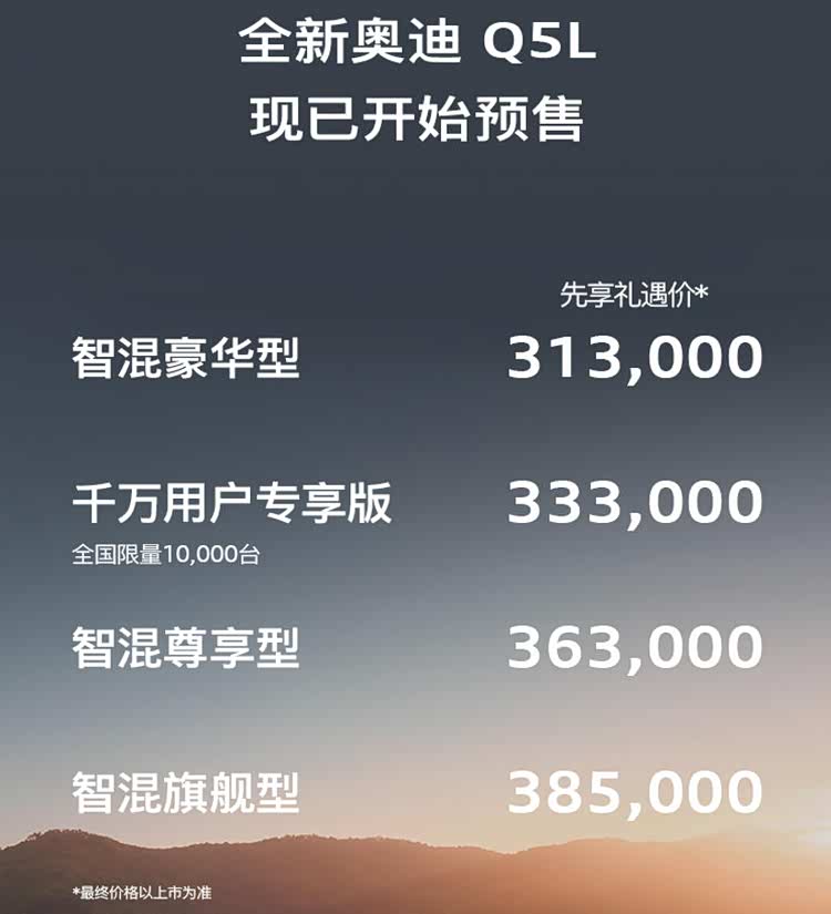 在价格上,全新奥迪Q5L预售价是31.3万-38.5万,你们感觉这个价格怎么样?如果正式上市你们感觉什么价格你会买,可以打在评论区厂家也许会看到!