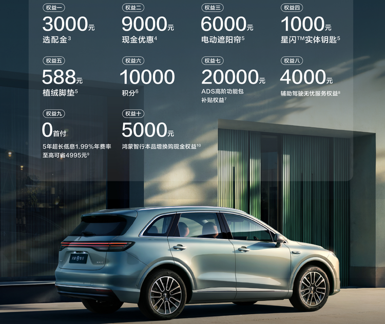 2026年1月购买尚界H5,可享受10大购车权益:3000元选配金、9000元现金优惠、6000元电动遮阳帘、1000元实体钥匙、588元脚垫、10000积分、20000元ADS高阶功能包补贴、4000元辅助驾驶无忧服务权益、0首付5年超长低息贷款优惠政策、5000元鸿蒙智行本品增换购现金权益。