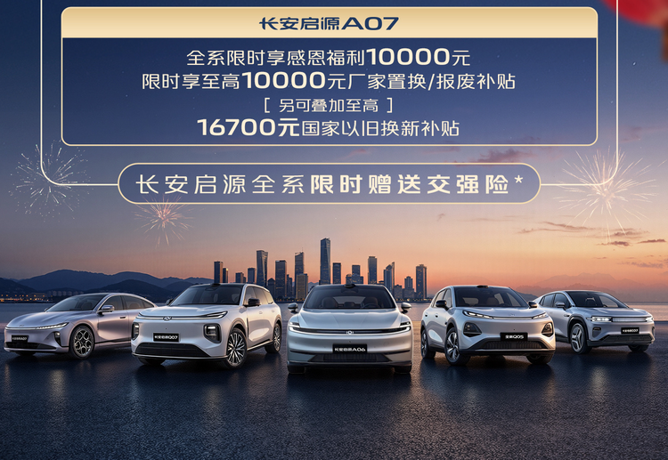 3、启源A07:至高10000元优惠、至高10000元厂家置换/报废补贴、至高16700元国家以旧换新补贴12%、赠送交强险;