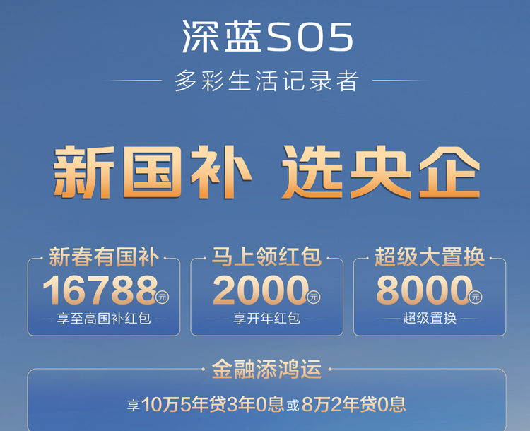 3、深蓝S05:在1月1日-2月28日购车,可享2000元开年红包、8000元置换补贴、5年贷款3年免息/贷款8万2年0息等;