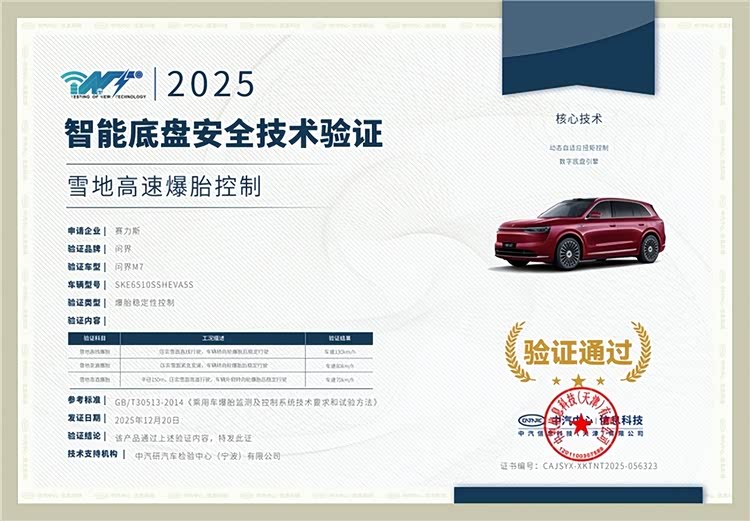 近日,来自中国汽车技术研究中心(中汽中心)的权威冬测报告,将聚光灯投向了在极寒环境中表现卓越的全新问界M7。这款“国民SUV幸福旗舰”,成功通过最低-30℃ 环境下的系列化科学测试,将“综合性能类验证”与“智能底盘安全技术验证”两大权威证书收入囊中,向业界与消费者清晰传递了其在极端气候下的卓越可靠性与全方位安全承诺。