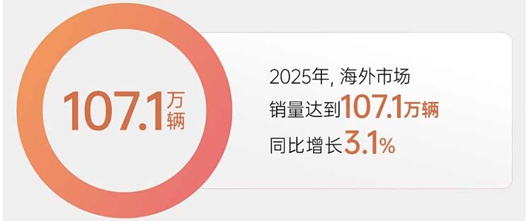 2025年,全年海外市场销量达到107.1万辆,同比增长3.1%,在行业中继续名列前茅。