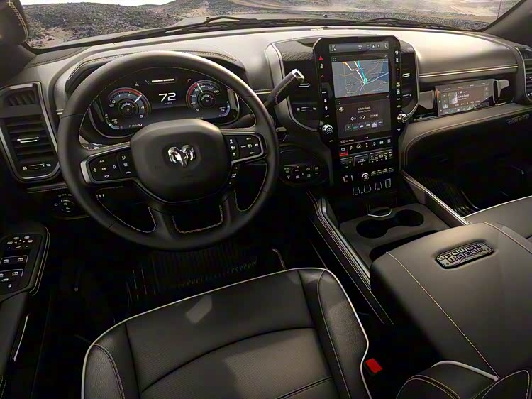 内饰部分,RAM 1500 SRT TRX并未走极端简化路线,而是通过软性材质覆盖、红色缝线与碳纤维饰板的组合,强化驾驶区域的辨识度。这里的设计重点并非视觉刺激,而是通过材质和结构,让驾驶员在激烈驾驶或颠簸路况下获得更清晰的操作反馈。14.5英寸中控屏搭载Uconnect 5系统,支持无线Apple CarPlay与Android Auto,这类功能在长途行驶中,对导航稳定性和多媒体使用便利性有直接影响。12.3英寸仪表盘的信息显示逻辑,能够在越野或高速工况下,快速读取车辆状态数据。