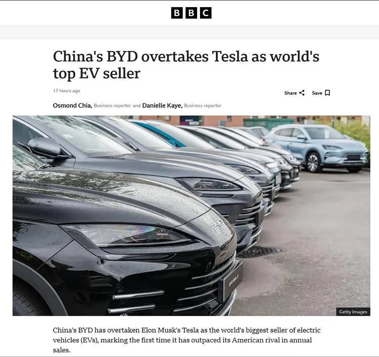 实际上,比亚迪一直是全球新能源销冠,只不过在19年到20年这段时间被特斯拉所超越,之后随着DM-i车型的大爆发,比亚迪再次反超,而且一年一个台阶,优势也越来越大。不过新能源汽车包括了纯电、插混两个大类,比亚迪是双管齐下,而特斯拉只做纯电车型。此前比亚迪新能源销量第一,而这一次光凭纯电车型销量就已经完成了对特斯拉的超越,成为全方位无死角,当之无愧的新能源销冠。