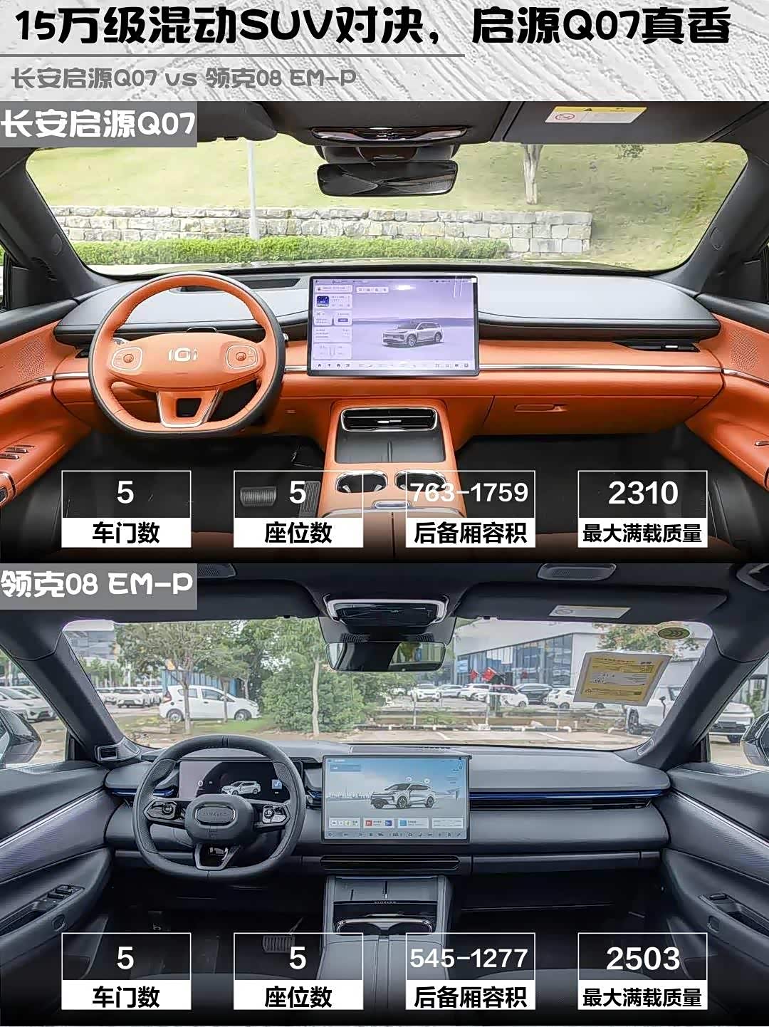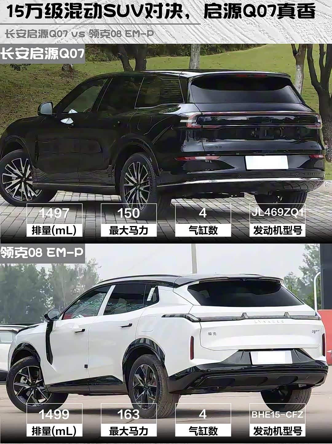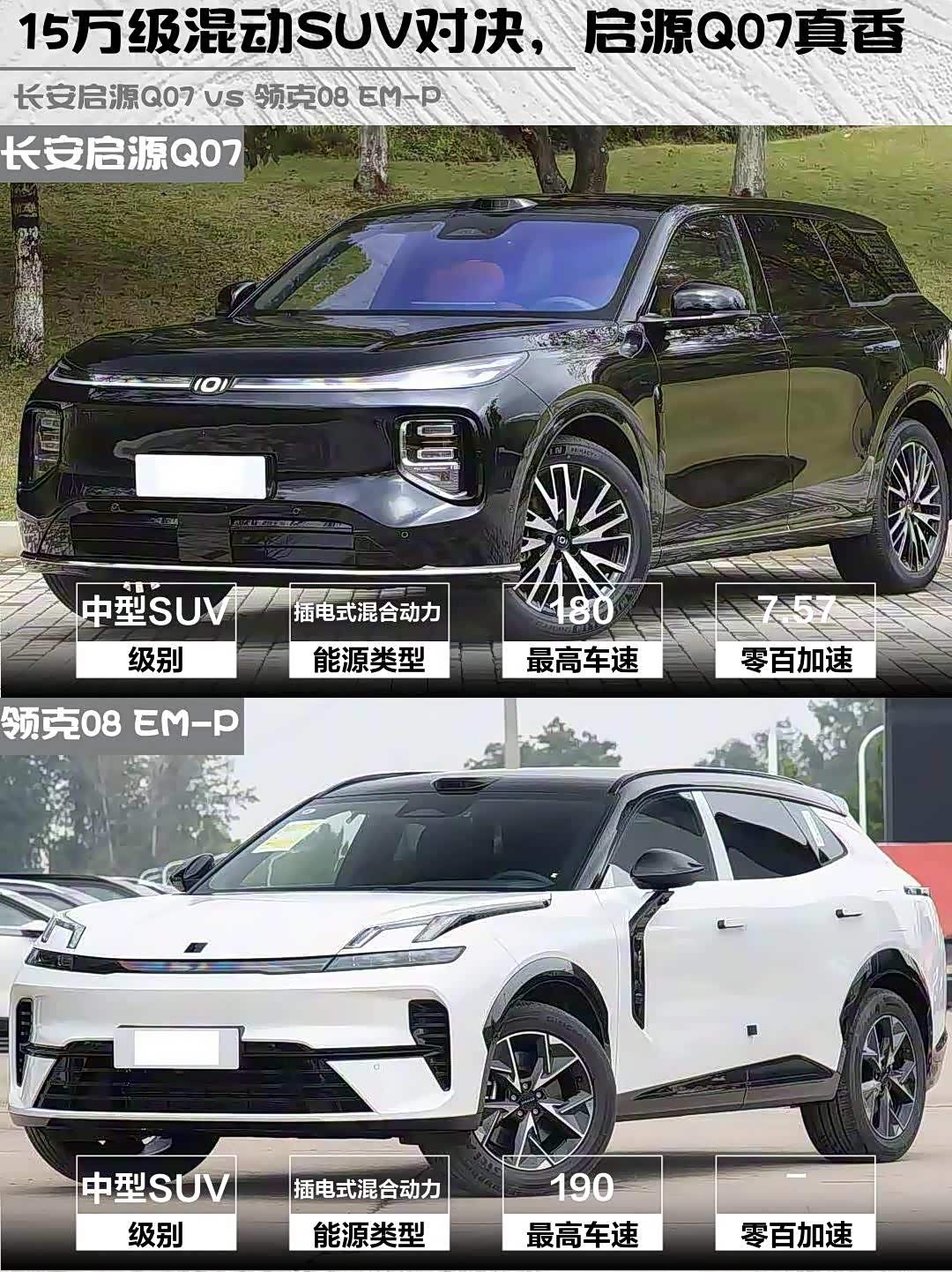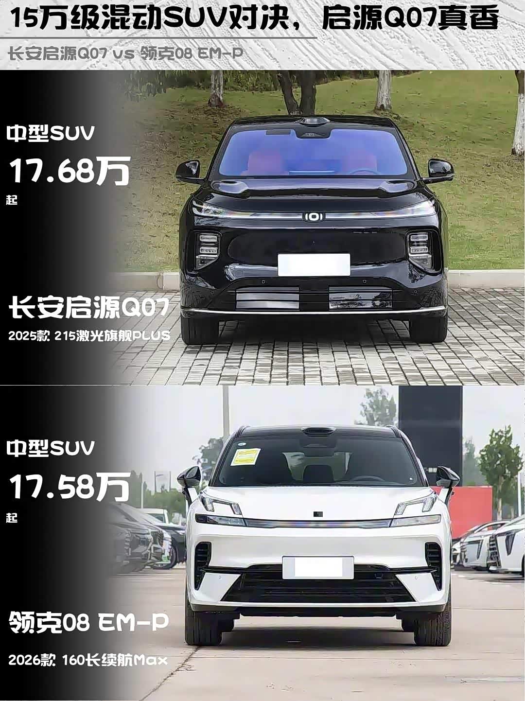 最近在选插混SUV的朋友看过来!今天深度对比两款热门车型——长安启源Q07 2025款 215激光旗舰PLUS和领克08 EM-P 2026款 160长续航Max,看完这篇就知道哪款更适合你!🔥
