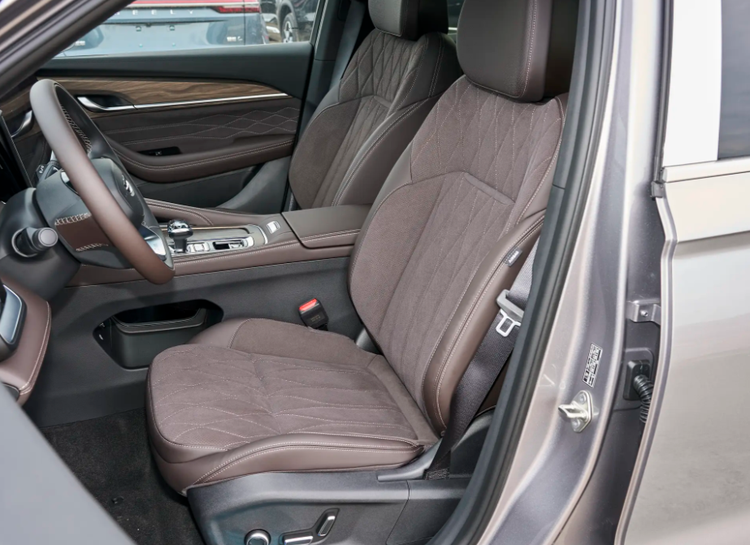 中控台大量使用软性材质和皮质包裹,搭配木纹饰板,触感柔软且质感上乘。缝线工艺精细,提升了内饰的整体档次。隐藏式的出风口与中控台整体风格融为一体,使内饰看起来更加简洁大方,同时也便于清洁。副仪表台集成了带镀铬装饰的物理按键,配备50W无线风冷超级快充,满足用户对手机充电的需求。