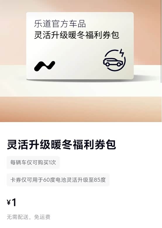 第二,是“对症下药”的资源倾斜与灵活升级。 针对北方冬季更严峻的挑战,乐道在电池投放计划中,明确对北方五省给予额外资源倾斜。更重要的是,伴随硬件加仓,乐道推出了极具吸引力的“电池灵活升级”优惠方案。用户仅需象征性的1元,即可获得高额优惠券包,从而以极低成本将车辆临时升级为85度大电池包。据官方数据,这对于60度电池用户而言,意味着冬季实际续航可提升约40%。此举相当于为用户提供了一个“按需续航”的弹性方案,长途出行前一键升级,从容应对低温与长途挑战,日常通勤则恢复标准配置,经济高效。