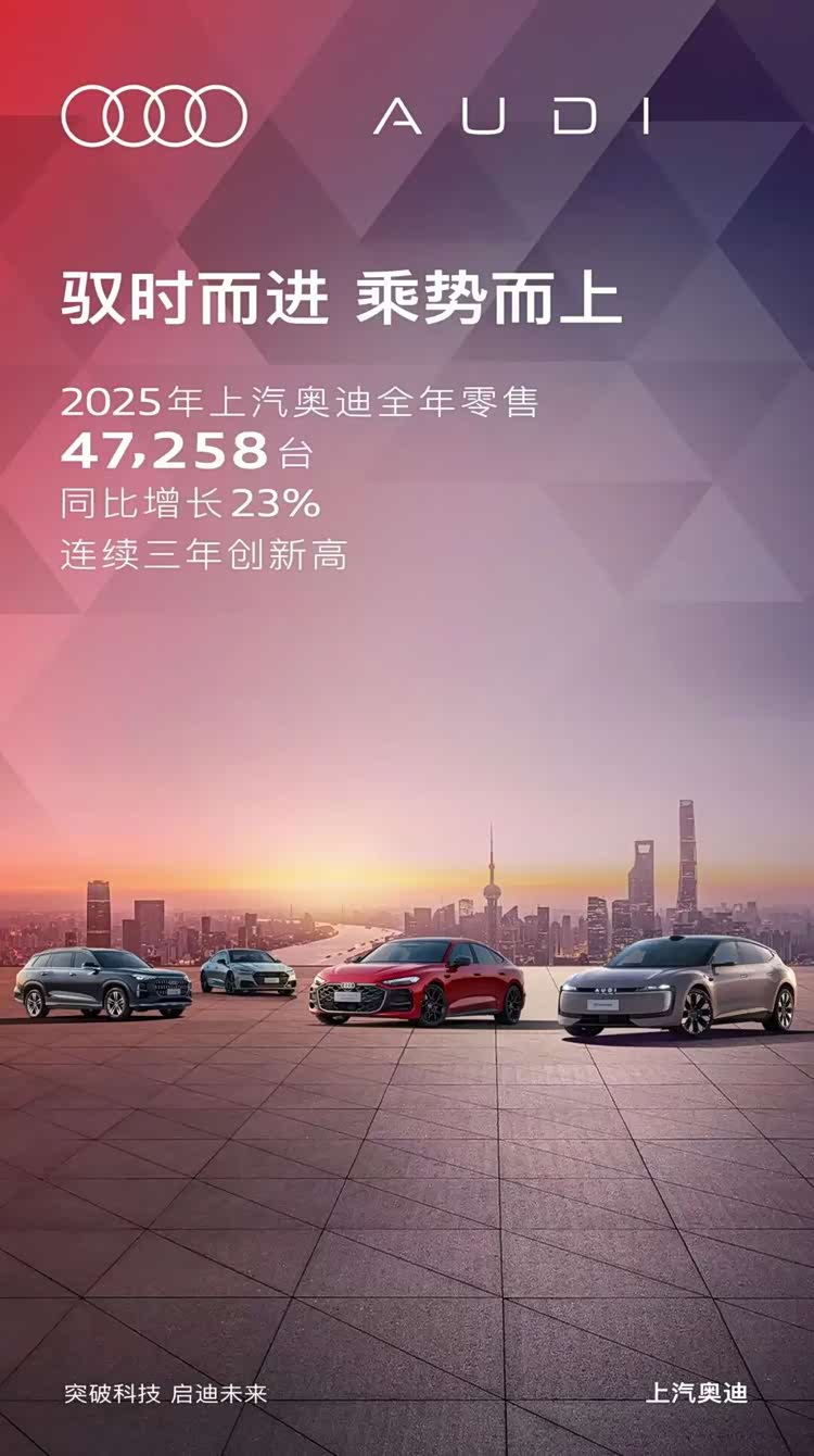 上汽奥迪2025年全年零售达47,258台,同比增长23%,实现年度销量稳健三连涨,展现出强劲的市场发展势能。持续向好的增长态势,得益于产品矩阵的高效焕新与精准布局。2025年,上汽奥迪接连推出两款重磅新车,全新上汽奥迪A5L Sportback作为全球首款搭载华为乾崑技术的燃油车,率先开启智能豪华燃油车新赛道;奥迪 E5 Sportback则深度融合德系豪华基因与中国智能科技,为追求高品质电动出行的用户带来全新选择。