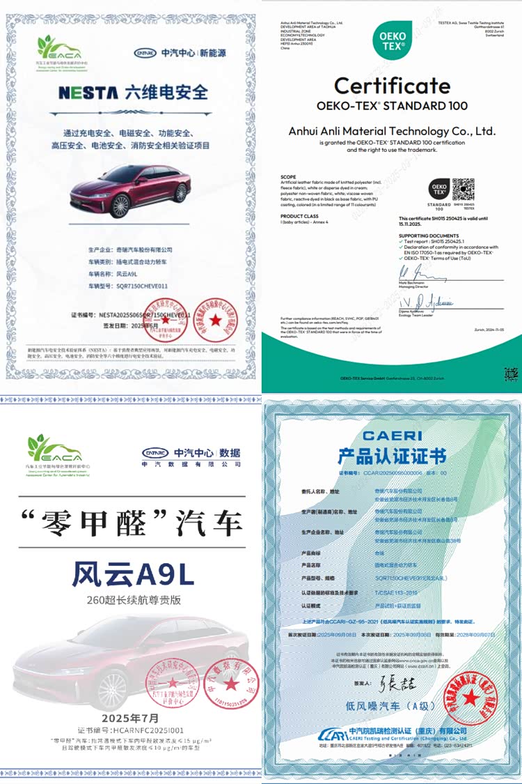 操控与动力的双重保障之外,用户最关注的安全与健康维度,风云A9L同样拿满认证。车辆通过NESTA六维电安全全项目验证并获评“NESTA高压安全年度车型”,260超长续航尊贵版更达成“零甲醛”汽车标准,座舱面料还通过OEKO-TEX®婴幼儿级生态纺织品认证。这些认证让用户无需担心电池安全隐患,车内呼吸环境堪比母婴级,再加上“低风噪汽车”认证带来的静谧体验,全家出行都能更安心舒适。
