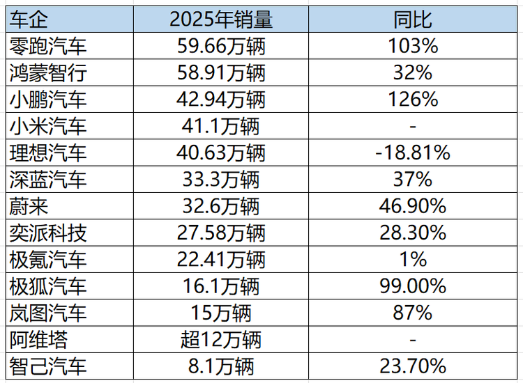 2025年刚落下帷幕,各大新势力品牌的全年销量数据相继出炉。如果说去年我们还用“内卷”来形容市场,那么今年这张成绩单只能用“洗牌”来概括——传统排名被彻底打散,黑马逆袭,老将失速,后来者凶猛,一场没有硝烟的份额争夺战结局出乎许多人预料。