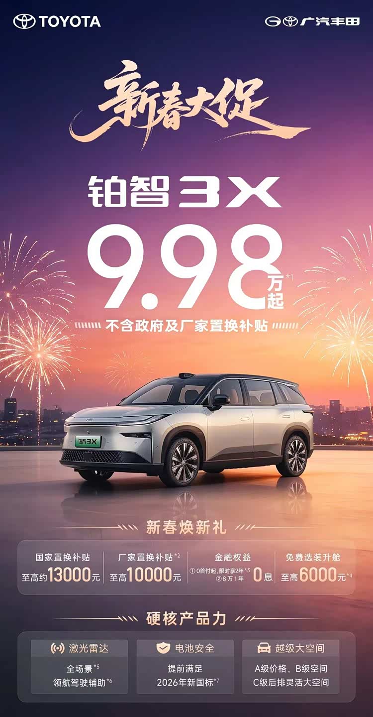 1月5日,笔者从广汽丰田官方获悉,旗下纯电紧凑型SUV—— 铂智3X(参数|询价)现已开启新春促销活动,限时9.98万元起,该价格不含政府及厂家置换补贴。作为参考,广汽丰田铂智3X提供430公里、520公里、610公里(CLTC工况)纯电续航版本,官方指导价10.98万-15.98万元。