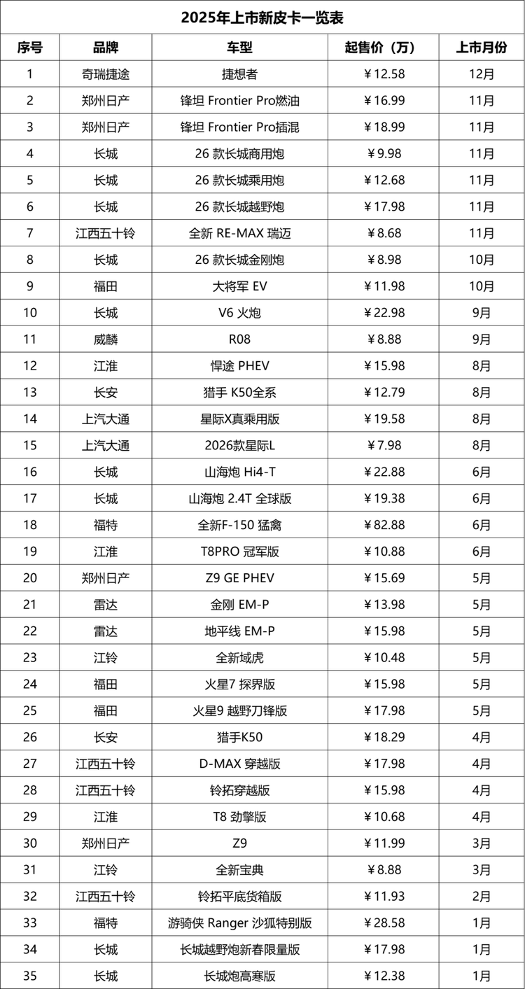 2025年国内皮卡市场新品迭代频繁,覆盖燃油、柴油、混动、纯电等多元动力类型,精准匹配商用、乘用、越野等全场景需求。各大车企纷纷发力,从入门级创富车型到高端越野版本全面布局,多达35款新车为消费者提供了丰富选择。今天就来从最近的12月到1月的顺序全面盘点一下。