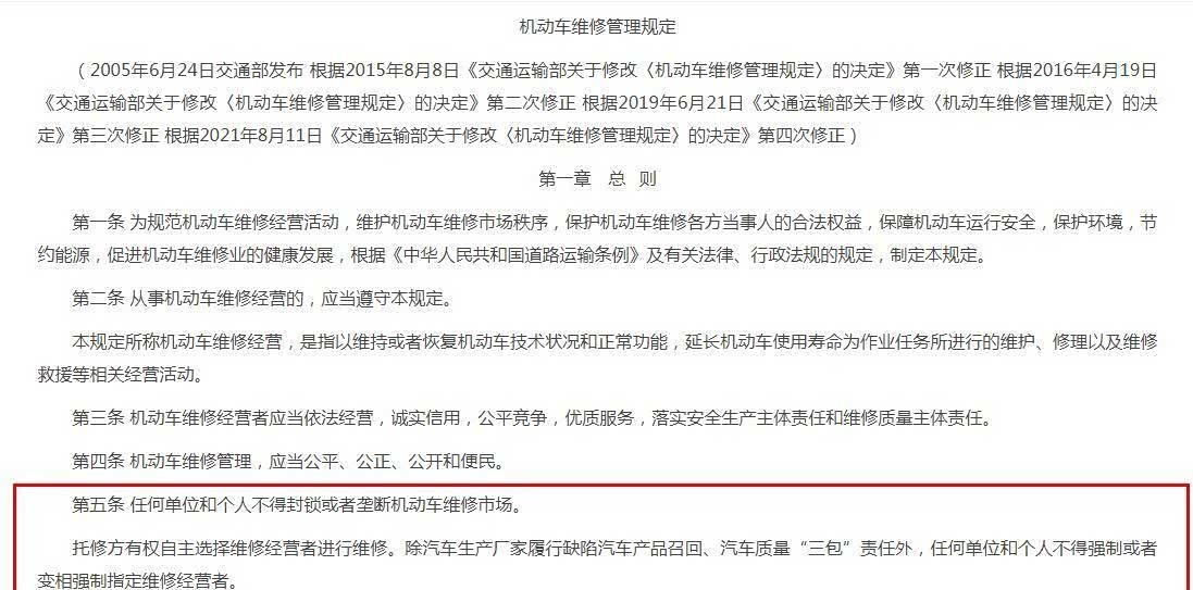 交通部的《机动车维修管理规定》明确说了,除了厂家召回和三包责任,任何企业或个人都不能强制指定维修经营者。