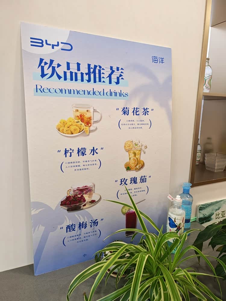 除了正餐以外,还有免费的咖啡、饮料、零食,水果。你只要豁出老脸,美国的斩杀线都斩不动你,比亚迪的4S店就能让你把肚子填饱。