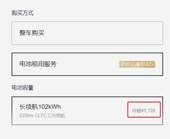 贷款套路多是出了名的,但是,蔚来这边还算是好点,实际上,如果你现在手头不宽裕,还差了10万左右,还想买蔚来ES8,你别说,蔚来给你提供了一条新的思路,那便是租电池方案,直接把价格给你打下来,减少10.8万,每个月收取1128元的电池费,这个价格看起来是不是就很有优势了,的确,这跟贷款没什么区别了。