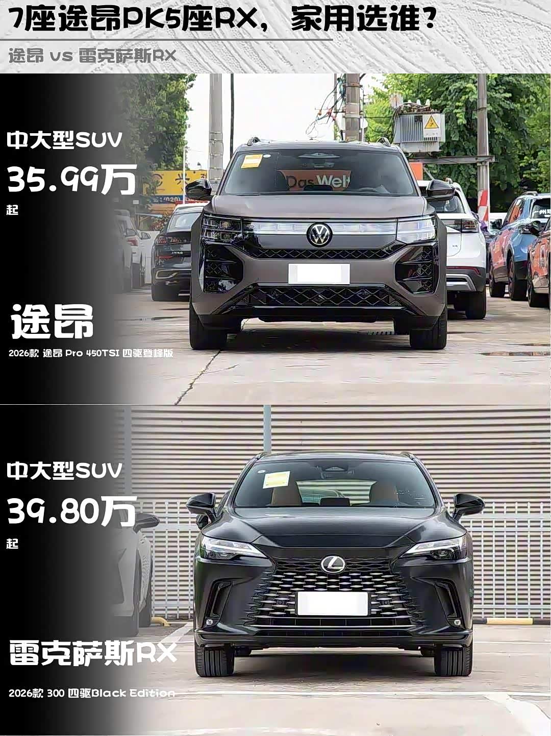 最近陪发小选车,纠结2026款途昂Pro 450TSI四驱登峰版(35.99万)和雷克萨斯RX 300四驱Black Edition(39.8万)。作为两款都深度试驾过的老司机,掏心窝子说说对比感受👇