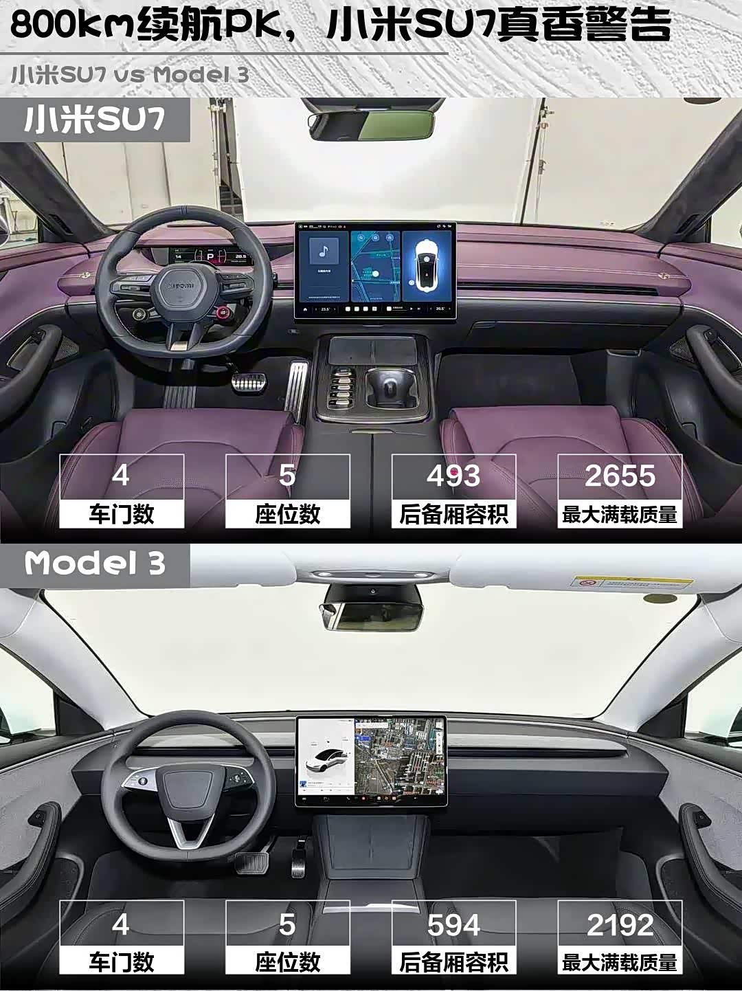 小米轴距3000mm比Model 3长,但溜背造型牺牲后排头部空间。Model 3后备箱594L更实用,前备箱还能当外卖保温箱!不过小米的Nappa真皮座椅通风/加热全配齐,Model 3要选装...