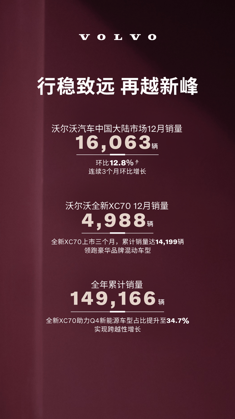 近日,沃尔沃汽车公布2025年12月中国大陆市场销量数据。数据显示,沃尔沃12月单月销量达16,063辆,环比增长12.8%,全年累计销量149,166辆,在市场波动加剧的背景下,延续了相对稳健的增长态势。