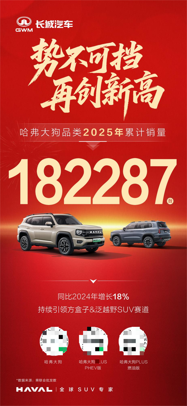 2025年,哈弗狗品类再传捷报:全年累计销量达182,287辆,历史累计销量更是突破731,977辆!截至2025年年底,哈弗狗品类已经实现连续19个月销量破万、累计43个月蝉联泛越野及方盒子品类销量冠军,在泛越野赛道上书写了从“开创者”到“引领者”的市场传奇。