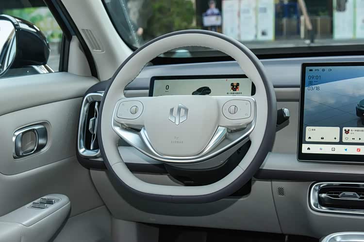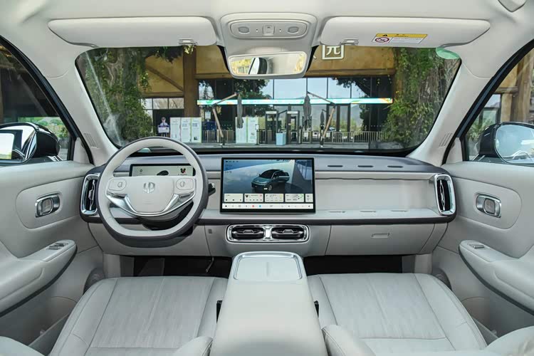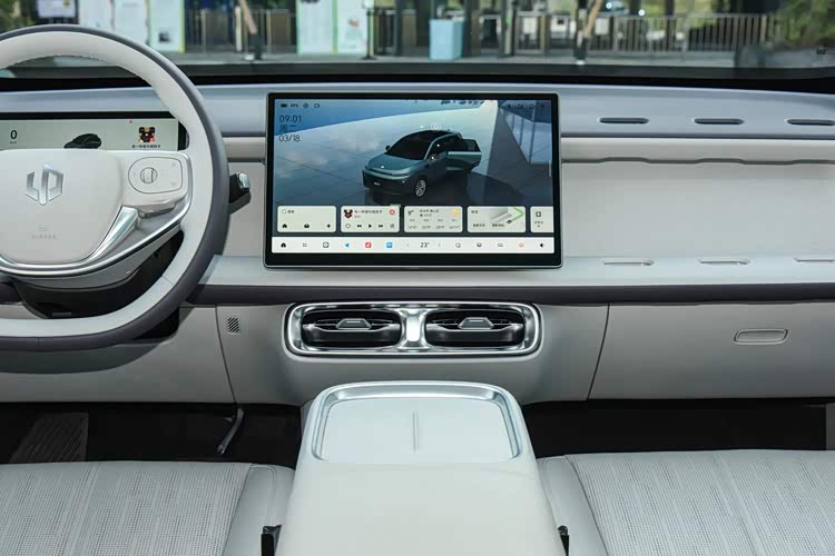 中控台布局:双幅式平底方向盘(支持加热功能)、电子怀挡换挡机构、8.8英寸液晶仪表盘、14.6英寸2.5K悬浮式中控屏。