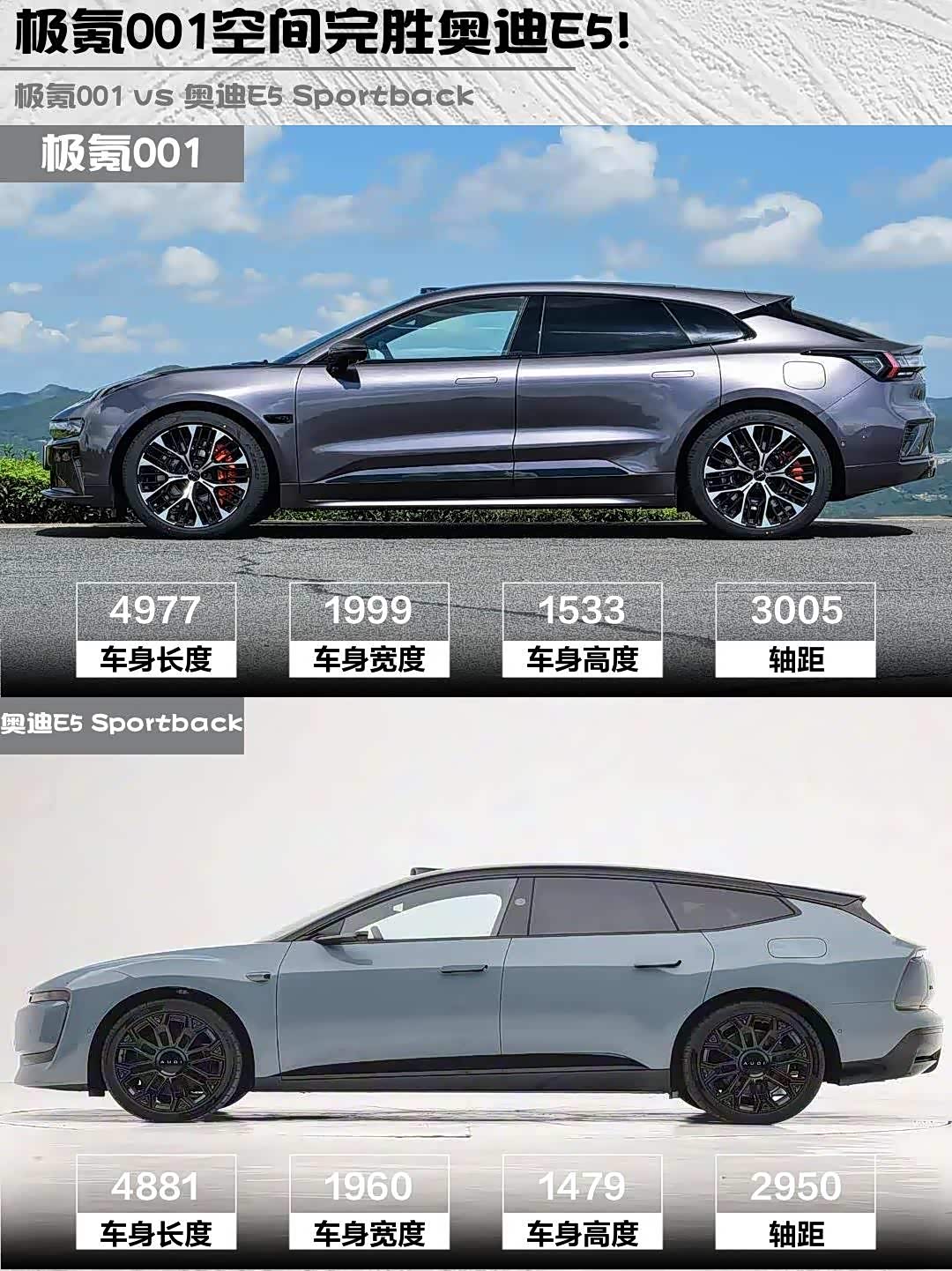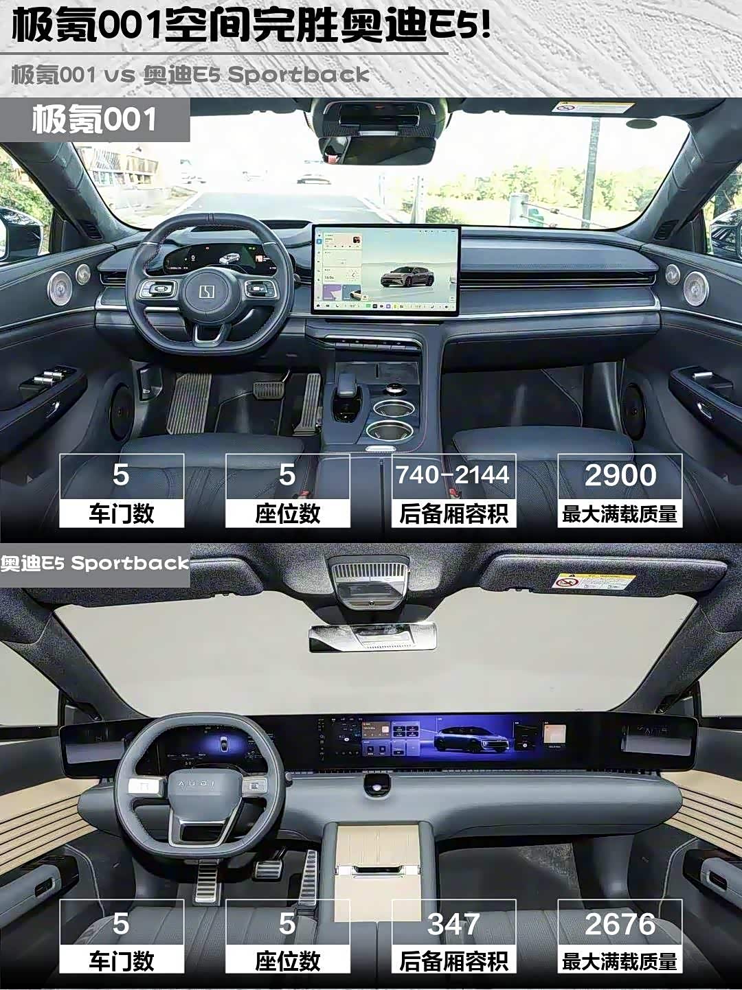 极氪001猎装车尾门开口1.8米,放倒座椅秒变2144L移动大床房!后排能跷二郎腿。奥迪E5溜背造型牺牲了些头部空间,但2950mm轴距腿部空间够用,后备箱暗格设计很德系精致。