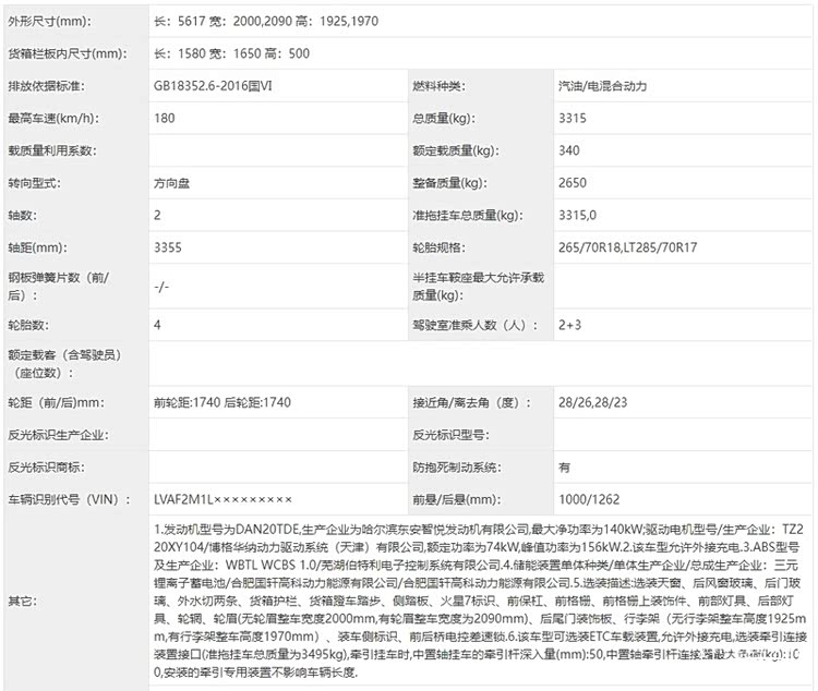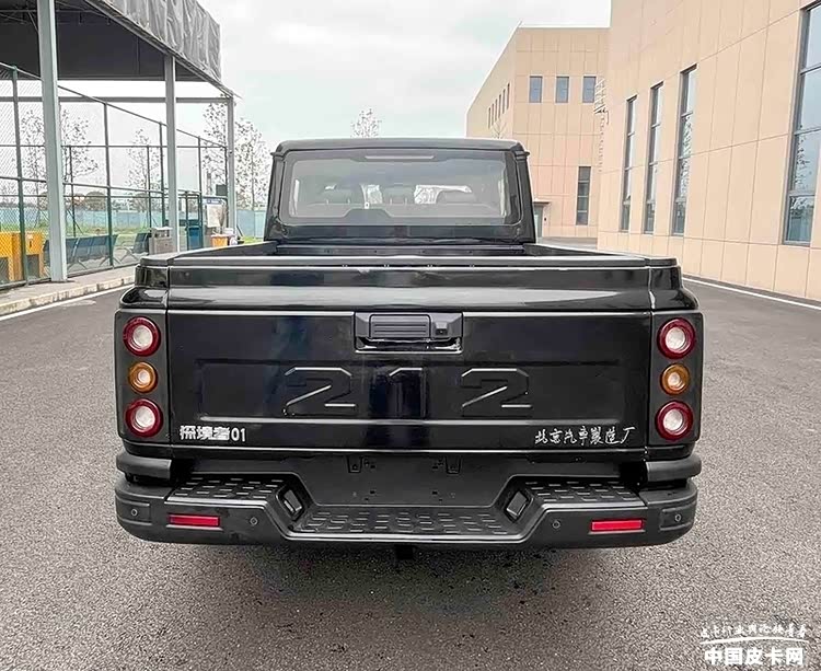 外形方面保留了212 T01的标志性的一拱、二圆、三横、四纵的设计语言,前部几乎和SUV版本一模一样。后部增加了货箱,并且前后是整体式设计,货箱与座舱并无断开。根据工信部信息显示,该车拥有42°接近角、26°离去角。除此以外,新消息显示该车还会拥有254mm的最小离地间隙以及850mm原厂涉水深度。之前工信部申报的2.3T柴油版本参数为140kW/500N·m;混动版将会是插电混动的形式,并且与燃油版一致,都会匹配采埃孚8AT变速箱。该车原厂还具备3吨拖挂资质,尾箱配备锚点导轨系统和220V电源接口,搭配80L大油箱,续航里程将会非常不错。