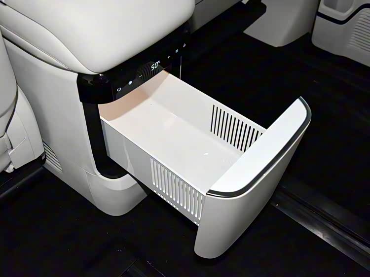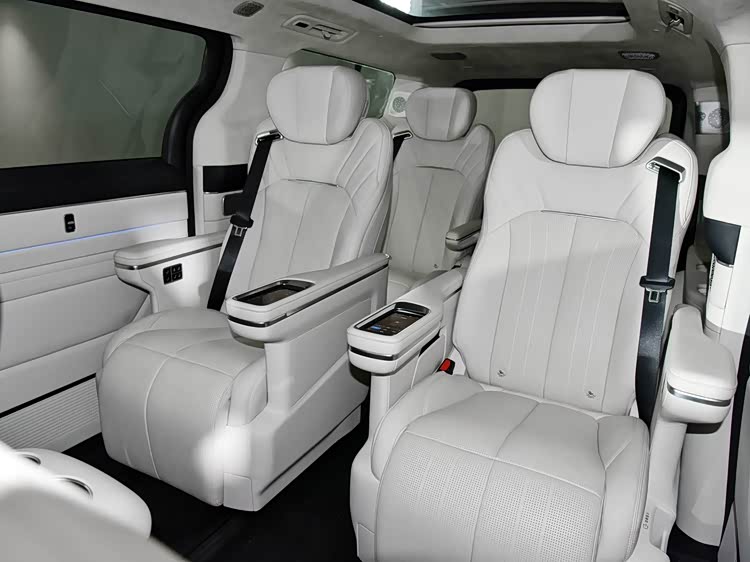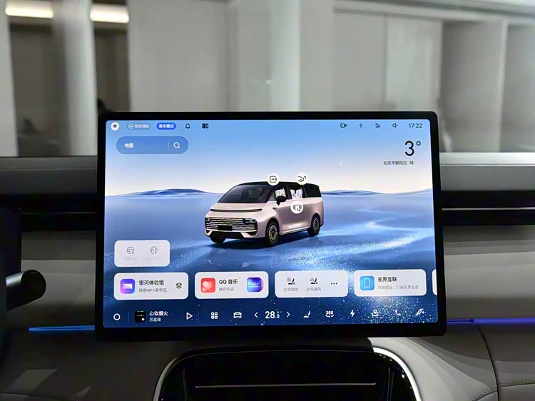 进入车内,银河V900搭载15.4英寸中控屏+10.25英寸仪表屏,岛台的设计和物理按键的排布有所不同。另外二排也有吸顶娱乐屏、小桌板以及冰箱,并且有6座、7座和8座三种座椅布局,因为车比较长,所以纵向腿部空间还是可以的。