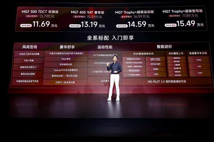 1月6日,MG旗下旗舰轿跑MG7 2026款在广州正式上市,此次推出4款车型,限时补贴价11.69万~15.49万元。作为MG品牌在燃油车领域持续深耕的最新成果,MG7 2026款以“全系标配”为核心主张,将豪华跑车同款的自适应三段式电动尾翼、真双边四出尾排、8155芯片及AI大模型等一系列以往仅出现在高端车型上的配置,全面覆盖全系车型,更将E-LSD电子限滑差速器、mCDC智能可调电控悬架等高端驾控配置下放至15万元以内,真正实现轿跑平权,重新定义15万级轿跑价值标杆。此次上市不仅是 MG7(参数|询价)产品的迭代升级,更是MG品牌“技术平权”价值理念的生动实践。