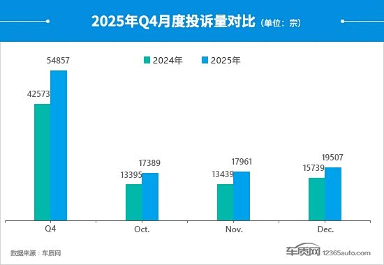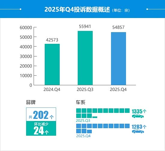 2025年四季度,车质网共受理消费者对汽车产品的有效投诉54,857宗(含第三方平台和后装轮胎投诉共139宗),环比下降1.9%,同比上涨28.9%。据车质网数据统计,本季度共受理202个汽车品牌及1,283个车系的投诉,较上季度减少了24个品牌和52个车系。